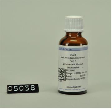 Braunes, zylindrisches Glas mit weißem Schraubdeckel ohne Sicherheitsring. Etikett der Firma Gatt-Koller. Enthält Bittermandelöl ätherisch (blausäurefrei).