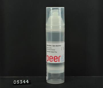 Transparentes, zylinderförmiges Kunststoffgefäß mit Dispenser und farbloser Schutzkappe. Vertrieben von der Firma Farmalobor aus Canosa di Puglia (BT) unter dem Namen Airless LS75. Enthält 70 g Desinfektionsgel, Eigenherstellung der Apotheke Peer.