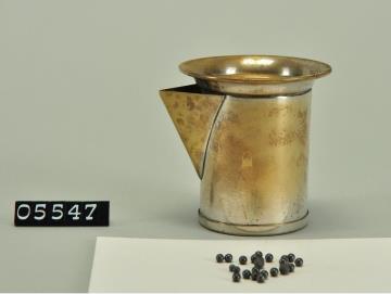 Tarierbecher aus Messing vernickelt mit einem Ausguß. Der Becher diente zum Tarieren bei Balkenwaagen verwendet. Er wird solange mit Schrotkugeln gefüllt, bis der Gewichtsausgleich erzielt ist. Erst dann wird das erforderliche Gewicht hinzugefügt. Enthält einige Schrotkugeln.