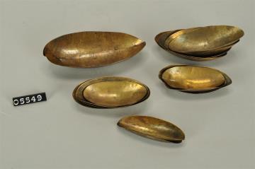15 Tarierschiffchen verschiedener Größe. Wurde solange mit Schrotkugeln aus dem Tarierbecher gefüllt, bis der Gewichtsausgleich erzielt war. Erst dann wird das erforderliche Gewicht hinzugefügt.