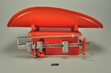 Säuglingswaage mit Gewichtsablesung. 15 Kilogramm Tragkraft. Spätere orange Übermalung. Wägeschlitten verchromt. Italienisches Fabrikat mit Seriennummer 1630