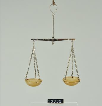Präzisions-Handwaage mit extrafeinem Messingbalken und halbrunden Hornschalen an Messingketten.