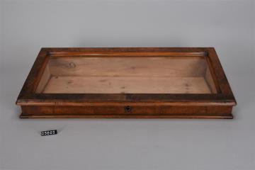 Zwei Kästen aus furniertem Holz mit schrägem profiliertem Glasdeckel für die Präsentation von Waren. Boden mit Profil. Wurde in der Offizin (Verkaufsraum) vor der Balkenwaage positioniert. Waren bereits in der alten Apotheke vor dem Umbau 1914 in Gebrauch. Dienten noch bis ca 1985.