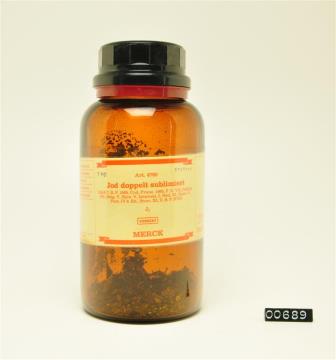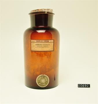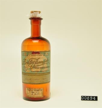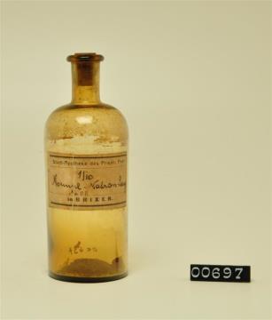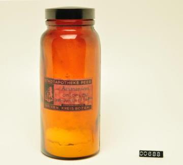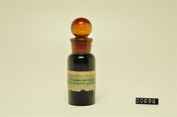 Extrakt-Gefäß, rund, braun mit eingeschliffenem, kugelförmigem Hohlstopfen zur Aufnahme von Trockenmittel. Verdickter, abgeflachter Mündungsrand. Etikettiert