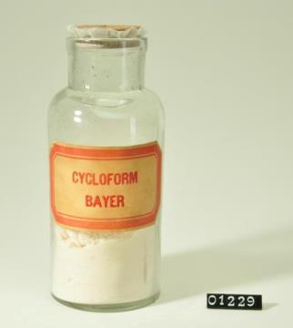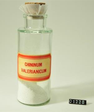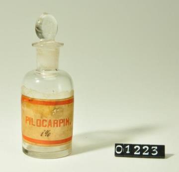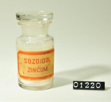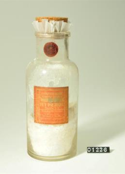 Rundes Pulverglas mit Stopfen aus farblosem Glas mit leichtem Grünstich. Verstärkter, flacher Mündungsrand. Mit rot umrandetem und rot bedrucktem Papierschild signiert. Mit Etikettenlack überzogen.