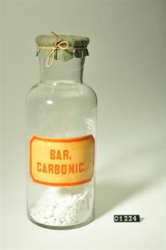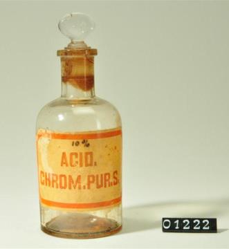 Rundes, farbloses Pulverglas mit Stopfen. Verstärkter, flacher Mündungsrand. Mit rot umrandetem und rot bedrucktem Papierschild signiert. Mit Etikettenlack überzogen.