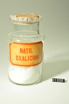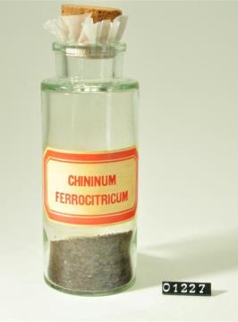 Rundes, farbloses Pulverglas mit Stopfen und Hefteisenabriss. Ausgebogener Mündungsrand. Mit rot umrandetem und rot bedrucktem Papierschild signiert. Mit Etikettenlack überzogen.