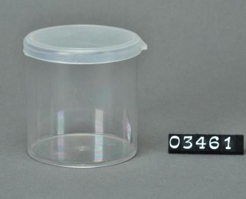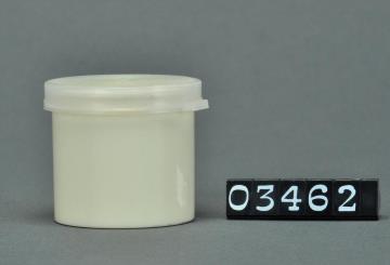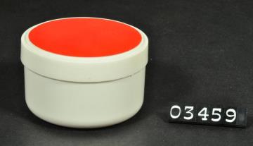 Runde weiße Salbendose aus weichem Kunsstoff mit rot bedrucktem Stülpdeckel. Bodenkante abgerundet und Boden leicht eingewölbt mit Standring. Boden und Deckel innen Prägung mit Nummern.