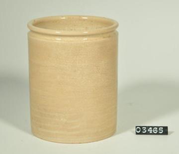Runder, zylindrischer, hellbrauner, außen und innen glasierter Salbentopf aus Steinzeug mit Binderand. Leicht nach oben gewölbter, teilweis glasierter Standboden mit Prägung (16).