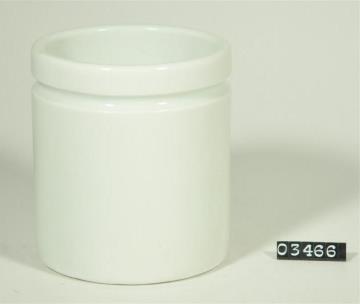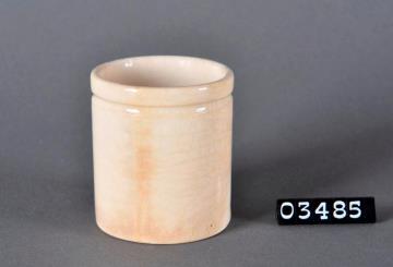 Runder, zylindrischer, weißer, außen und innen glasierter Salbentopf aus Steinzeug mit Binderand. Leicht nach oben gewölbter, unglasierter Standboden mit Prägung (500).