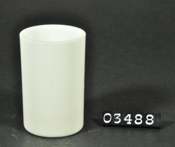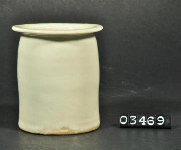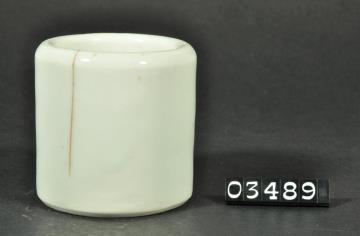 Weißerm, zylindrischer, glasierter Topf mit dicker Wandstärke aus Porzellan. Leicht nach oben gewölbter Gefäßboden unglasiert. prung in der Wand.