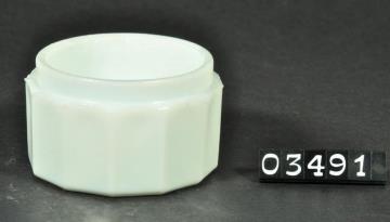 Zwölfkantiger, innen runder Topf aus milchigem Glas. Oberer Rand glatt und rund für einen Stülpdeckel. Gefäßboden mit Standring und nach außen gewölbtem Boden. Höchstwahrscheinlich Behälter für kosmetische Creme.