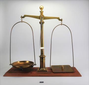 Balken- oder Apothekerwaage, auch Rezeptur- oder Tarawaage genannt. Aus Eisen, angemalen. Waagkasten aus Holz, schwarze Abdeckung mit Profil, zwei Schubladen. Waagsäule klassizistisch ausgeführt. Balken mit französischem Gehänge. Fixe Schalen aus Messing, 160mm Durchmesser an rechteckigen Doppelstangen. Zeiger nach unten, Skala (Gradbogen) aus Elfenbein. Tragkraft 500g. Dazu verbogenes Messingetui für Centigrammgewichte mit seitlichen Stiften für Deckel(?). Um Schneiden und Balken zu schonen liegt auf einer Waagschale immer ein Gewicht. Hier ein Gewicht mit 20g. Einige Eichstempel.