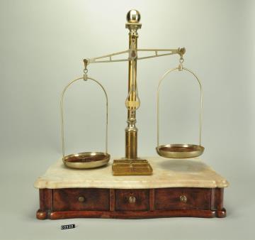 Balken- oder Apothekerwaage, auch Rezeptur- oder Tarawaage genannt. Aus Messing. Waagkasten aus Holz mit drei Schubladen und profilierter, geschwungener Marmorabdeckung. Mittlere Schublade mit Loch für Rezepturfaden. Runde Waagsäule. Waagrechter, symetrischer, zweiarmiger, durchbrochener Balken, prismatische Endachsen, abnehmbare Schalen, 155mm Durchmesser an Doppelstangen. Senkrechter Zeiger, mit Gradbogen (=Skala) aus Elfenbein. Tragkraft 1kg. Um Schneiden und Balken zu schonen liegt auf einer Waagschale immer ein Gewicht. Hier 20g. Waag-Einlegeschalen aus Preßstoff (Bakelit?). Verschließbarer Messingbehälter (Etui) für Zentigrammgewichte aus Aluminium ohne Glasabdeckung und ohne Gewichte. Viele Eichstempel. Stand bis ca.1996 auf dem Handverkaufstisch, nachdem der Computer eingeführt wurde, benötigte man den Platz für die Bildschirme. Waagkasten stammt aus dem 19. Jh.