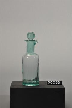 Hellgrünes Original Lamprechts-Patent-Tropfglas, runde Form. Eingeschliffener Glasstöpsel. Gießlippe am Flaschenhals. Seitliche Naht. Der runde Kopf ist eingeschnitten
