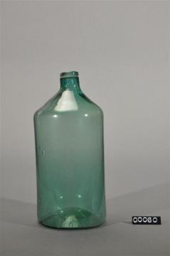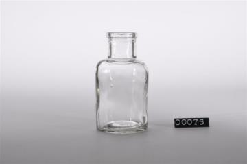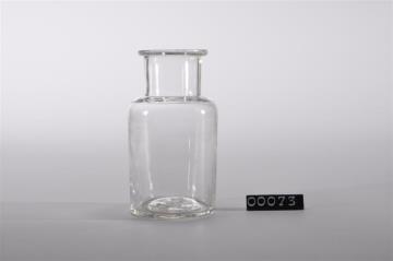 Farbloser, zylindrischer Flaschenkörper mit kurzer Schulter. Mündungsrand mit umgelegtem Faden. Leicht hochgestochener Boden. Mit Bodenprägung.