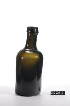 Dunkelolivgrüne runde,teilweise eingedrückte Flasche mit langem Hals. Grünes Glas. Leicht hochgestochener Boden. Mündung verdickt.