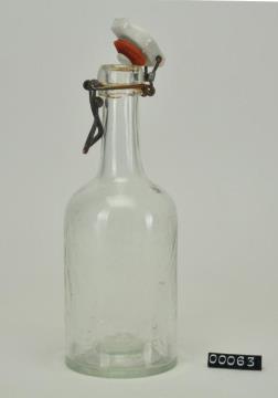 Farblose Enghalsflasche aus Glas, langer Hals mit Klappverschluss. Klappverschluss (Bügelverschluss) aus Porzellan mit Gummidichtung. 1877 ließ sich der aus Magdeburg stammende Hermann Grauel den Klappdeckelverschluss patentieren. Unter der Bezeichnung Seltersverschluss blieb er bis 1969 der vorherrschende Verschluss für Mineralwasser.