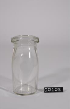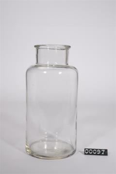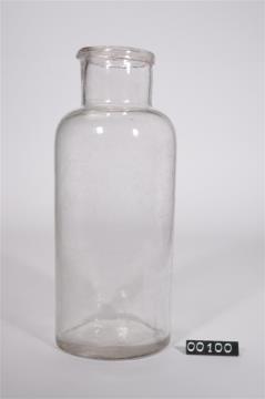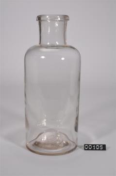 Zylindrischer, farbloser Flaschenkörper mit stark verdicktem Mündungsrand. Bodenprägung mit Herstellernamen.