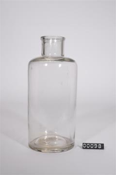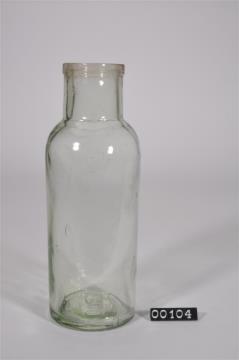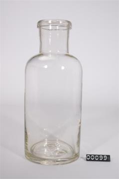 Farbloser, zylindrischer Flaschenkörper mit abgeflacher Schulter, seitlicher Naht und vielen Lufteinschlüssen; Hals mit leicht verdicktem Mündungsrand. Etwas hochgestochener Boden ohne Bodenprägung.