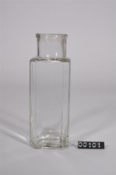 Achtkantiger rechteckiger Flaschenkörper mit abgfallender Schulter; Mündungsrand verstärkt. Etwas hochgestochener Boden ohne Bodenprägung.