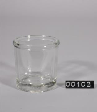 Becherförmiges, sich nach oben öffnendes farbloses Glas; Mündungsrand etwas verdickt. Bodenrand geriffelt.