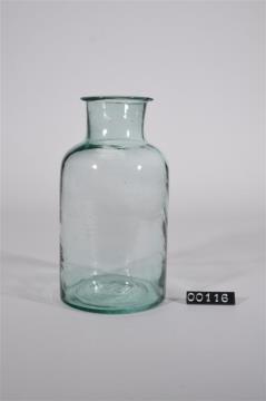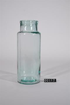 Hellgrüner, zylindrischer Flaschenkörper mit flacher Schulter; Mündungsrand mit angeschmolzenem Glasfaden. Seitliche Naht. Etwas hochgestochener Boden mit Bodenprägung.