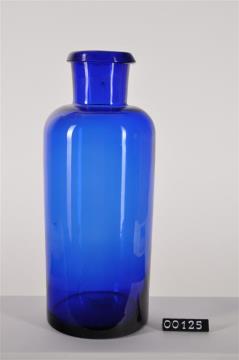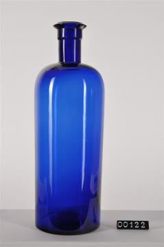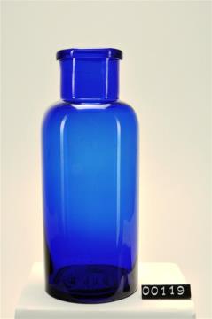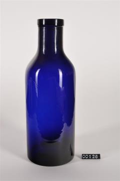 Blauer, zylindrischer Flaschenkörper mit flacher Schulter; Flaschenhals mit Abstufung. Mündungsrand verdickt mit spitz auslaufendem umgelegten Glasfaden. Seitliche Naht. Leicht hochgestochener Boden mit Bodenprägung.