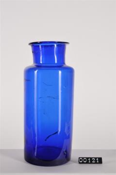 Dunkleblauer, zylindrischer Flaschenkörper mit hochgezogener Schulter; Mündungsrand verdickt. Mit vielen kleinen Lufteinschlüssen. Hochgestochener Boden, großer Standring.