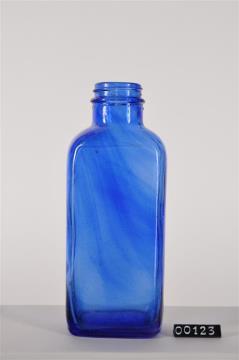 Blauer, rechteckiger Flaschenkörper mit abfallender Schulter, Schlieren und Seitennaht; Mündungsrand mit Schraubgewinde. Leicht nach oben gewölbter Boden ohne Bodenprägung.