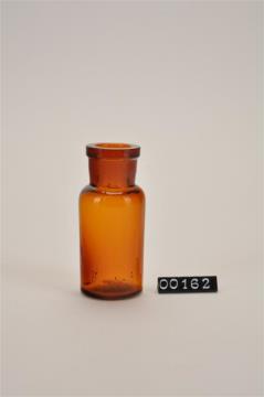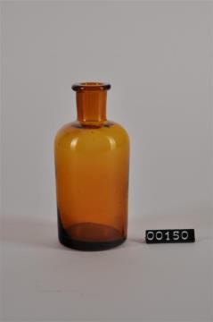 Brauner, zylindrischer Flaschenkörper mit abfallender Schulter; Mündungsrand verdickt. Mit Seitennaht. Nach oben gewölbter Boden mit Bodenprägung.