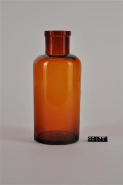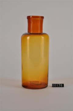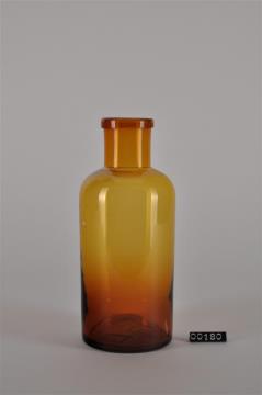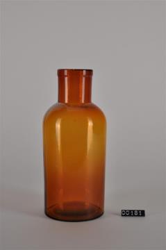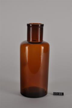 Brauner, zylindrischer Flaschenkörper, maschinell hergestellt, mit abfallender Schulter und langem Hals; seitliche Naht. Mündungsrand verdickt. Nach oben gewölbter Boden mit Bodenprägung.