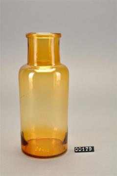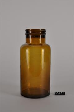 Brauner, zylindrischer Flaschenkörper, maschinell hergestellt, mit abfallender Schulter und kurzem Hals; mit Lufteinschlüssen. Mündungsrand verdickt. Nach oben gewölbter Boden mit Bodenprägung.