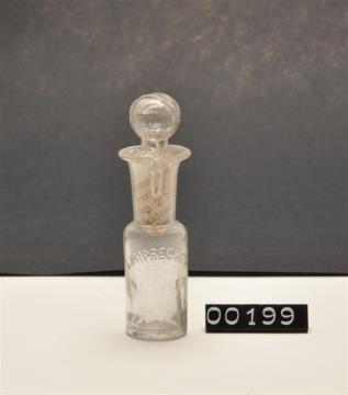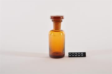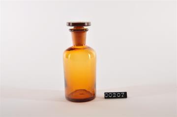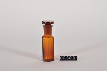 Enghalsflasche, sechseckige Form mit eingekerbten Schliffstopfen zur sicheren Anbringung des Rezepturfadens. Flaschenkörper an drei Seiten längsgeriffelt und an drei Seiten glatt. Braunes Glas.