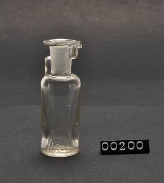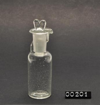 Tropfglas, runde Form mit herzförmigem Schliffstopfen (zur sicheren Anbringung des Rezepturfadens), farbloses Glas mit vielen Lufteinschlüssen.