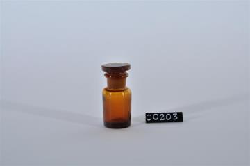 Brauner, zylindrischer Flaschenkörper mit kleiner, runder Schulter und flachem Schliffstopfen. Ohne Prägung.