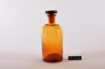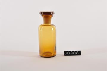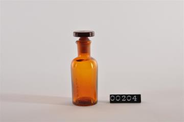 Brauner, zylindrischer Flaschenkörper, ausgebogener Mündungsrand mit flachem Schliffstopfen. Ohne Bodenprägung.
