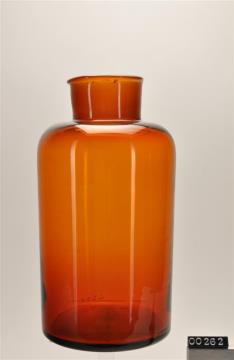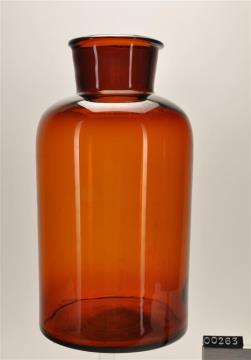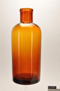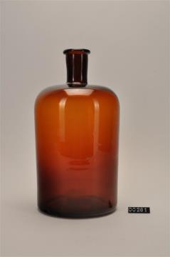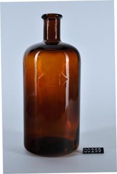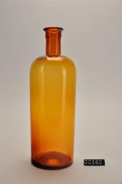 Brauner, runder Flaschenkörper. Mündungsrand mit umgeschlagenem Mündungsrand, runde Schulter, leicht nach innen gewölbter Boden. Geschliffene Mündung. Ohne Schliffstopfen.