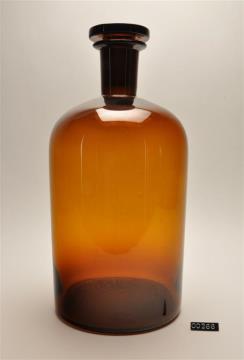 Brauner, runder Flaschenkörper, maschinell hergestellt, ausgebogener, leicht verdickter Mündungsrand mit eingeschliffenem Stopfen, runde Schulter leicht nach innen gewölbter Boden.
