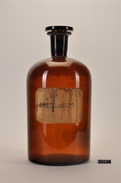 Brauner, runder Flaschenkörper, maschinell hergestellt, ausgebogener, leicht verdickter Mündungsrand mit eingeschliffenem Stopfen, abfallende Schulter, leicht nach innen gewölbter Boden. Signiert von Toni Kerer. Enthielt Kreolin.