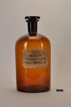 Brauner, runder Flaschenkörper, maschinell hergestellt, ausgebogener, leicht verdickter Mündungsrand mit eingeschliffenem Stopfen, abfallende Schulter, leicht nach innen gewölbter Boden. Signiert von Toni Kerer. Salzsäure heißt auch Acidum hydrochloricum.