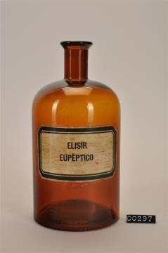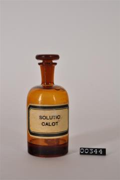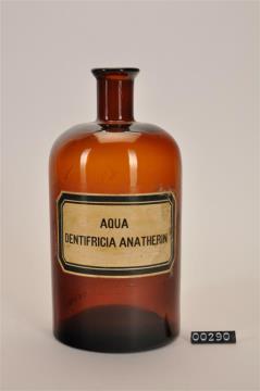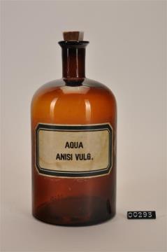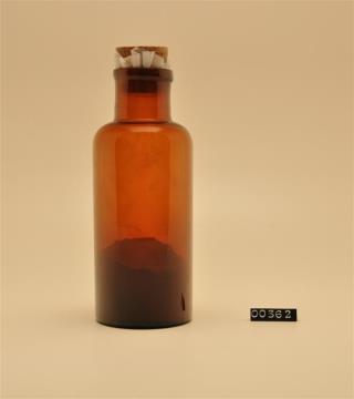 Brauner, zylindrischer Glaskörper, runde Schulter, weite Mündung für Schraubverschluss. Schraubdeckel aus Bakelit. Etikett der Antica Farmacia Peer. Beschriftet von Toni Kerer.