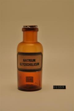 Brauner, runder zylindrischer Glaskörper, runde Schulter, weite Mündung mit verstärktem Rand. Mit Korkstopfen. Signiert. Schild mit Etikettenlack überzogen.