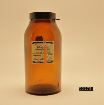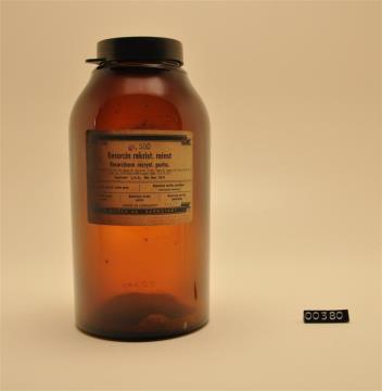 Brauner, zylindrischer Glaskörper, abfallende Schulter, weite Mündung für Schraubverschluss. Schraubdeckel aus Bakelit mit Öse für Siegelfaden und Innendeckel. Etikett der Firma Merck.