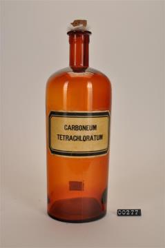 Runde, braune Enghalsflasche mit Korkstopfen. Maschinell hergestellt, manuell nachgearbeiteter Mündungsrand. Signiert. Enthielt Tetrachlorkohlenstoff.