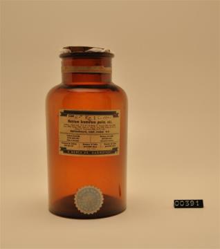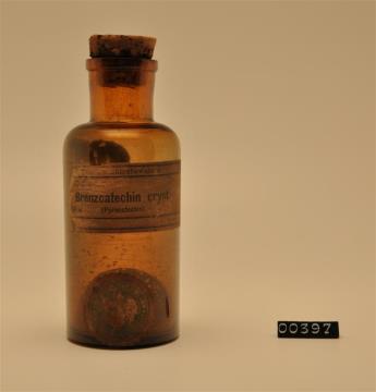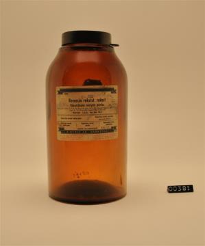 Brauner, zylindrischer Glaskörper, abfallende Schulter, weite Mündung für Schraubverschluss. Vieleckiger, runder Schraubdeckel aus weinrotem Bakelit mit Öse für Siegelfaden Etikett der Firma Merck.