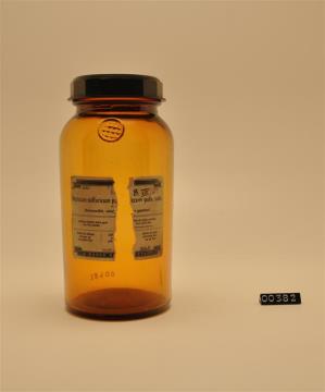 Brauner, zylindrischer Glaskörper, abfallende Schulter, weite Mündung für Schraubverschluss. Schraubdeckel aus Bakelit mit Öse für Siegelfaden und Innendeckel. Etikett der Firma Merck.