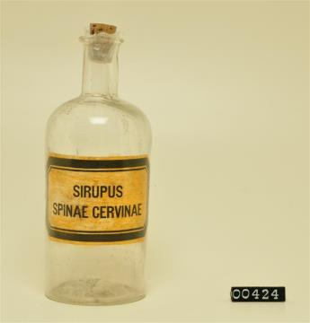 Brauner, zylindrischer Flaschenkörper, abfallende Schulter, enge Mündung für Schraubverschluss. Blaugrüner, seitlich geriffelter Schraubverschluss aus Kunsstoff. Mit Dymo-Band beschriftetes und mit Klarsichtklebe-Folie überzogenes Papierschild, achteckig, mit schwarzem Doppelrand und schwarzer Schrift auf ehemals weißem Grund. Darunter rotes Warnschild mit schwarz aufgedrucktem Flammensymbol. Enthielt Absinthii Tinctura composta = Magentropfen.