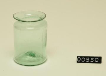 Farblose, zylindrische Enghalsflasche mit Korkstopfen. Abfallende runde Schulter. Maschinell hergestellt und manuell aufgesetzter Hals mit nachgearbeitetem, ausladendem Rand. Signiert mit einem an den Ecken beschnittenem und mit Schilderlack überzogenem Papierschild mit doppeltem schwarzem Rand und schwarzer Schrift auf weißem Grund.
