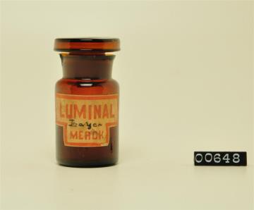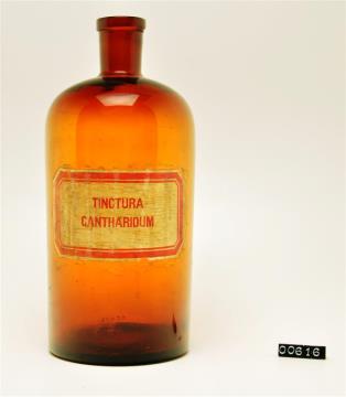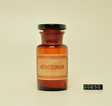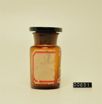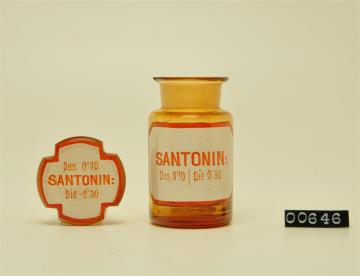 Rundes, hellbraunes Pulverglas mit signiertem Kreuzstopfen. Ausgebogener, abgeflachter Mündungsrand. Achteckiges, eingebranntes Emailleschild mit einfachem roten Rand und roter Schrift auf weißem Grund. Rot signiert. Enthielt Zitwerblüte = ArtemisiaCinae.